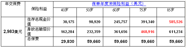 而理想人生具备了这两个功能,下面以30岁的男性,不吸烟,投保理想人生10万美金保额(20年缴费)为例,挑选关键年份,列出了主要的在生利益和身故利益,供大家参考。