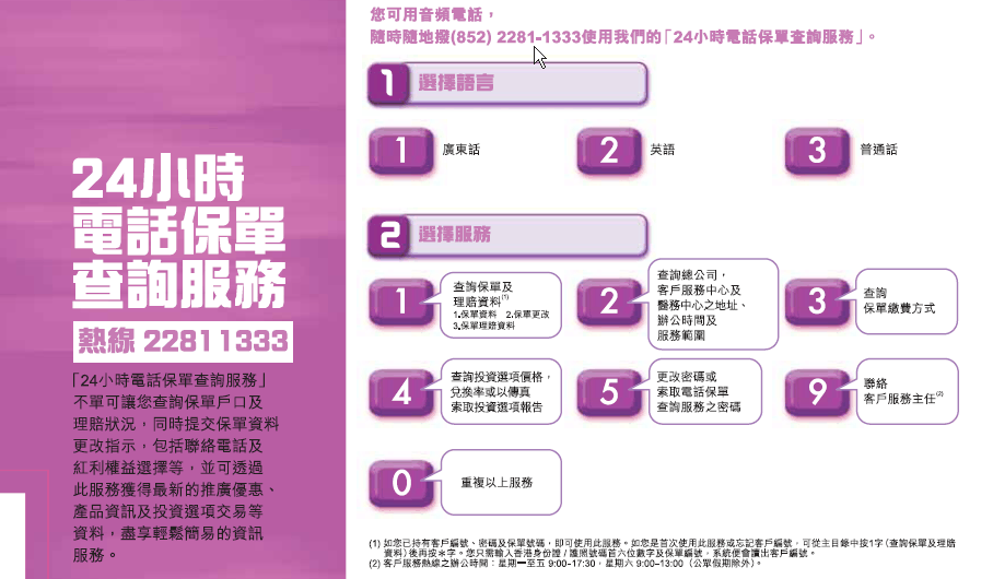 英国保诚一直致力提供以客为本的产品及服务。贵为英国保诚的尊贵客户,我们诚意邀请您使用「 24 小时电话保单查询服务」(电话号码: 2281 1333 )。